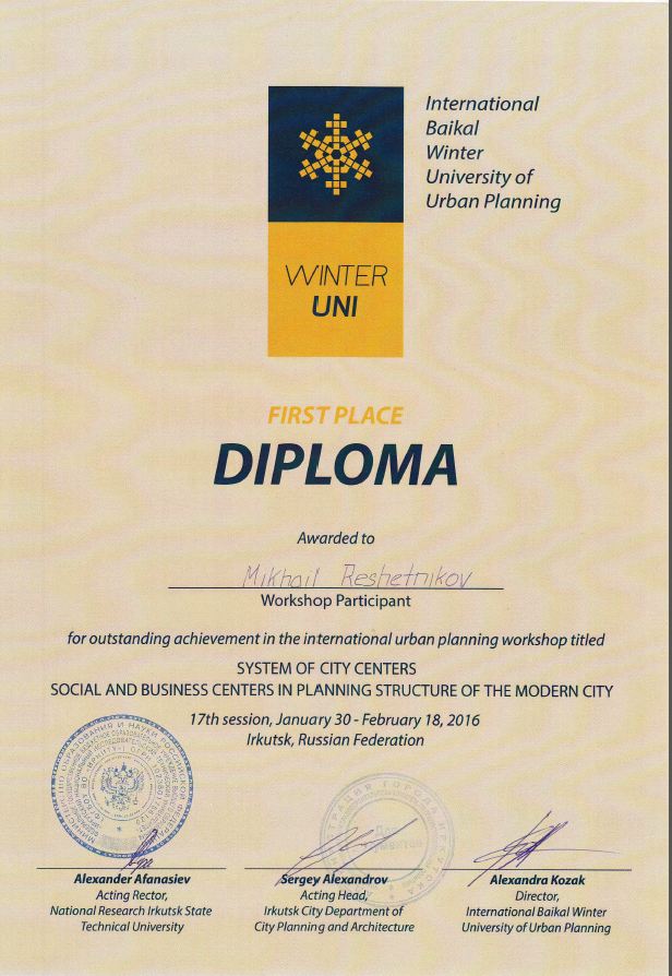 Со 2 по 19 февраля в ИРНИТУ прошел XVII Международный Байкальский Зимний градостроительный университет. В работе участвовало 5 команд, включавших в себя российских и зарубежных студентов. Идея этого зимнего градостроительного университета заключалась в развитии и благоустройстве отдельных городских территорий, бульваров, скверов и парков. Студенты нашей кафедры Михаил Решетников и Олег Унгаев в составе международных команд заняли соответственно первое и второе место. Работа их команд членами экспертного жюри была признана лучшей.